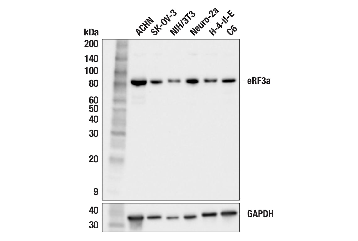 eRF3a (F9H3X) Rabbit Monoclonal Antibody recognizes endogenous levels of total eRF3a protein. This antibody does not cross-react with eRF3b. This antibody detects a 170 kDa band of unknown origin in some samples.