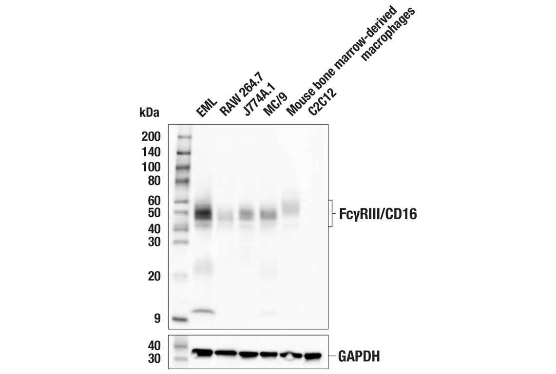 Fc-gammaRIII/CD16 (F6K6G) Rabbit Monoclonal Antibody recognizes endogenous levels of total mouse FcγRIII/CD16 protein. This antibody does not cross-react with mouse FcγRII/CD32 protein. This antibody detects a 10 kDa band of unknown origin in some cell lines.