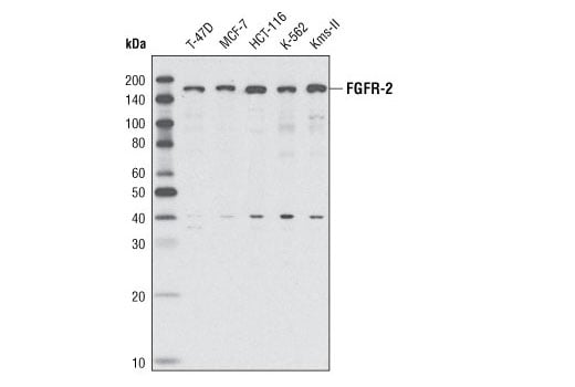 FGFR-2 has several splicing isoforms, with ligand specificity largely determined by alternative splicing of exons 8 (IIIb) and 9 (IIIc). Alternative splicing is cell type specific, resulting in isoforms showing various tissue distribution and biological activities (6,7). Mutations in the corresponding FGFR-2 gene cause syndromes characterized by facial and limb defects, including LADD Syndrome, Crouzon Syndrome, Beare-Stevenson Cutis Grata Syndrome, Pfieffer Syndrome, Apert Syndrome and Jackson-Weiss Syndrome. Mutations and altered expression of FGFR-2 may also be seen in cases of gastric, endometrial and breast cancer (8).