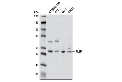 FLIP (D16A8) Rabbit mAb recognizes endogenous levels of total FLIP protein. This antibody detects a band of unknown origin at around 70 kDa.