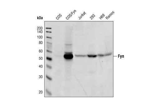 Fyn is a 59 kDa member of the Src family of tyrosine kinases. The carboxy terminus of Fyn shares extensive amino acid sequence homology with Src, but is very different within the amino-terminal 81 amino acid residues. The Fyn protein is synthesized and N-myristoylated on cytosolic polysomes and then rapidly targeted to the plasma membrane, where it is palmitoylated (3). The corresponding sequences surrounding Tyr416 and Tyr527 of Src are conserved in Fyn and thus may be similarly regulated by phosphorylation. Dually acetylated Fyn clusters in caveolae-like membrane microdomains and can interact with a variety of other signaling molecules. Fyn's biological functions are diverse and include signaling via the T cell receptor, regulation of brain function and adhesion mediated signaling (4, 5). Alteration of the levels of Fyn in appropriate target tissues may lead to better treatments for some related diseases.