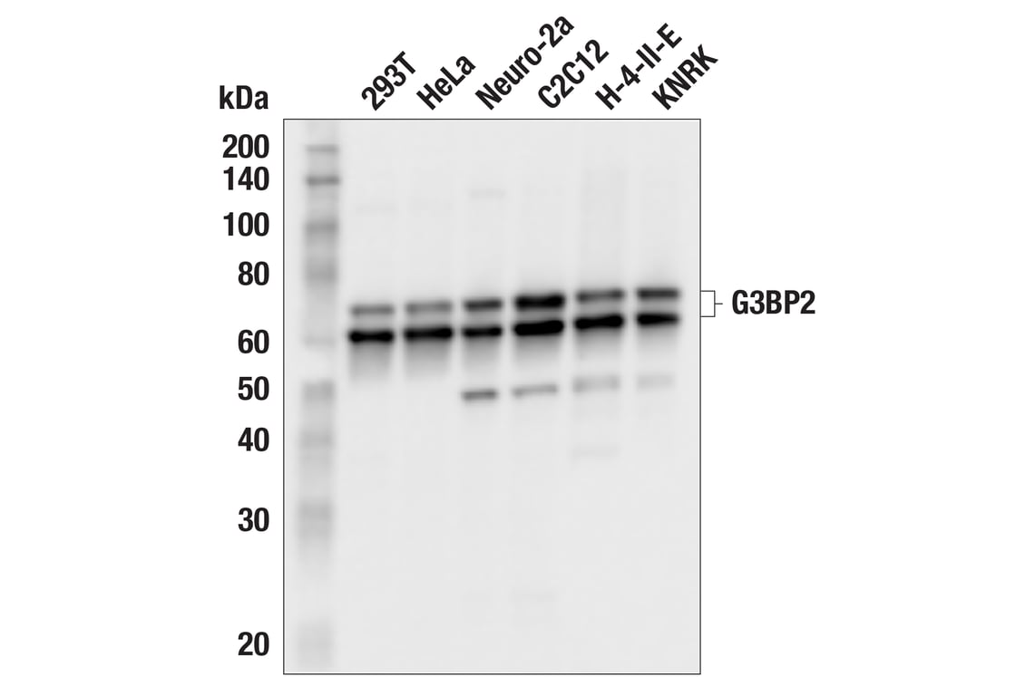 G3BP2 (F3Y7Z) Mouse Monoclonal Antibody recognizes endogenous levels of total G3BP2 protein. This antibody does not cross-react with G3BP1 protein. In rodent cells/tissue, this antibody may cross-react with a band of unknown origin around 48 kDa.