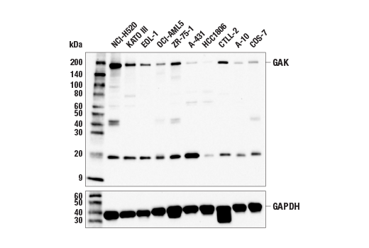 GAK (E7W7Z) Rabbit Monoclonal Antibody recognizes endogenous levels of total GAK protein. A band of unknown origin is detected at ~45 kDa and at ~20kDa.