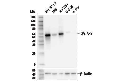 GATA-2 (E9T6F) Rabbit Monoclonal Antibody recognizes endogenous levels of total GATA-2 protein.