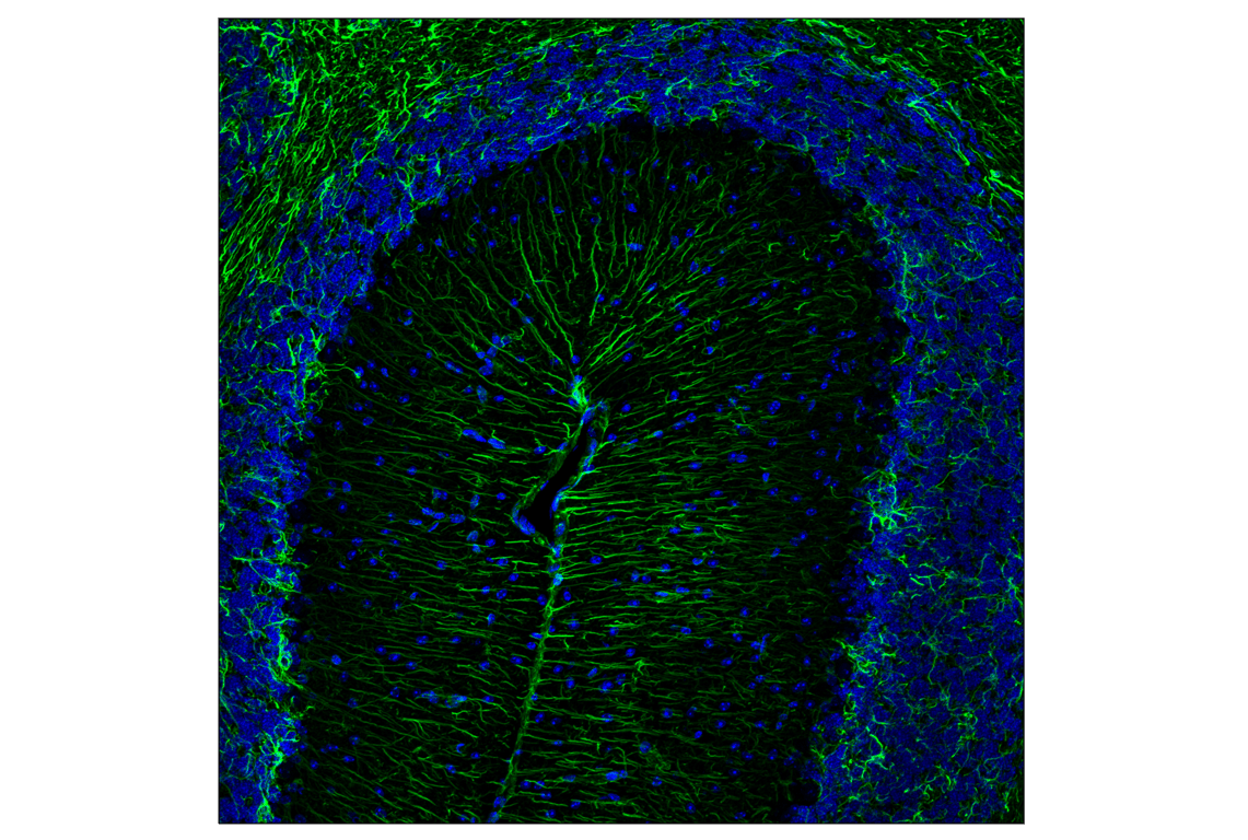 This recombinant chimeric antibody is engineered from GFAP (E4L7M) XP® Rabbit mAb #80788 according to animal-free protocols. The chimeric antibody retains its antigen-binding Fab regions from the original rabbit monoclonal antibody but contains a horse-derived Fc domain. When multiplexing, Fc-directed rabbit secondaries are required to detect rabbit-host primary antibodies.
