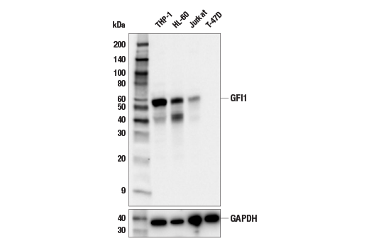 GFI1 (E5J6J) Rabbit Monoclonal Antibody recognizes endogenous levels of total GFI1 protein. This antibody may detect a band of unknown identity at 40kDa.