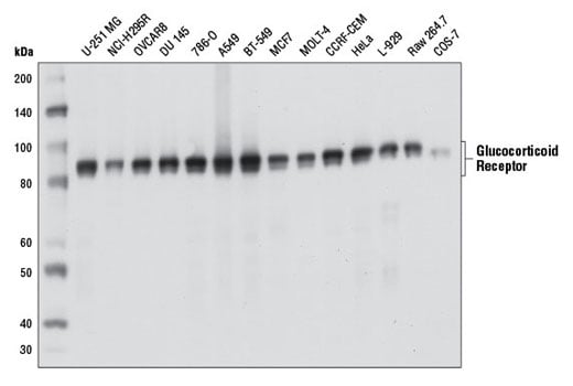 Glucocorticoid Receptor (D6H2L) Rabbit Monoclonal Antibody recognizes endogenous levels of total GR protein. This antibody reacts with GR-α and GR-β but does not cross-react with mineralocorticoid receptor.
