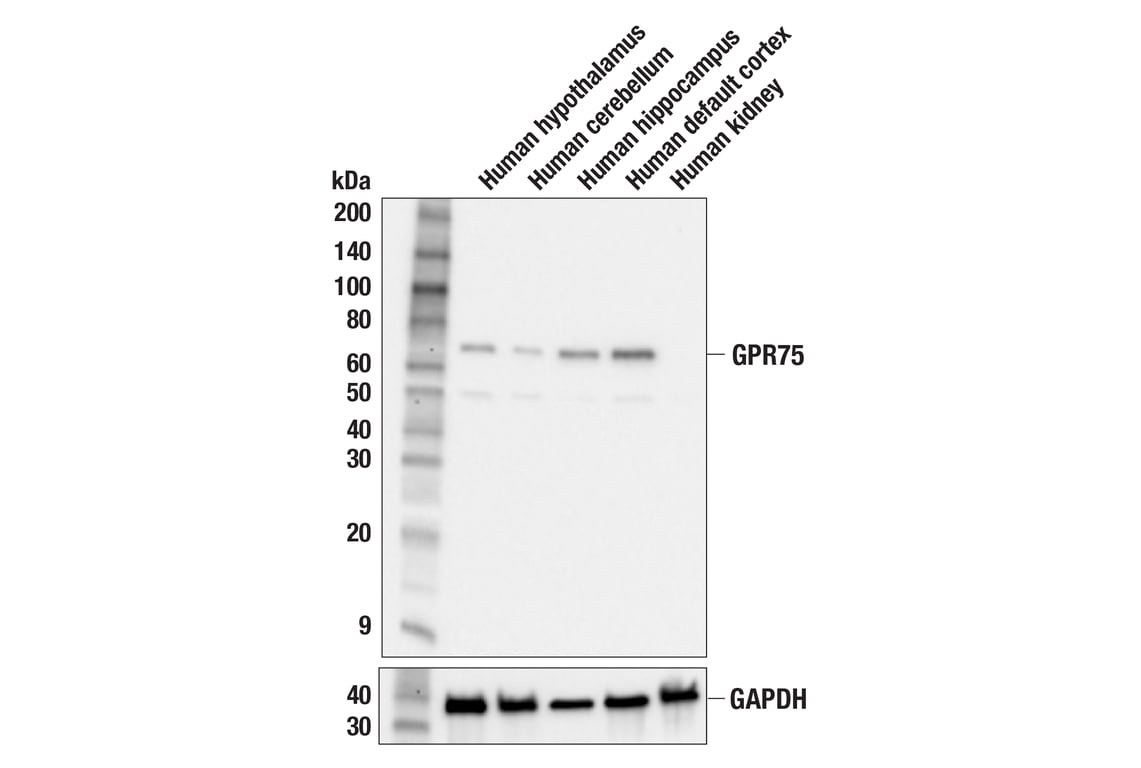 GPR75 (F3P5Y) Rabbit Monoclonal Antibody recognizes endogenous levels of total GPR75 protein. This antibody detects a 50 kDa protein of unknown identity in some tissues.