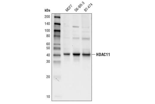 HDAC11 (D5I8E) Rabbit Monoclonal Antibody recognizes endogenous levels of total HDAC11 protein.