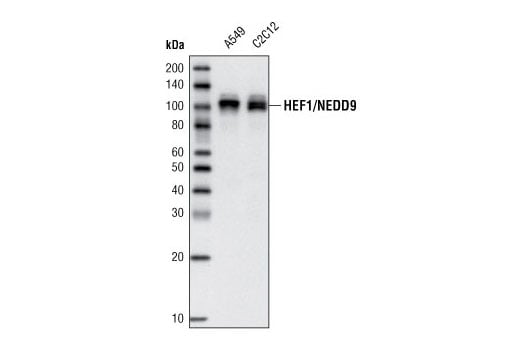 HEF1/NEDD9 (2G9) Mouse Monoclonal Antibody detects endogenous levels of total HEF1/NEDD9 protein.