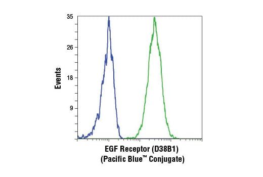 EGF Receptor (D38B1) Rabbit Monoclonal Antibody (Pacific Blue™ Conjugate) detects endogenous levels of total EGF receptor protein. This antibody conjugate does not cross-react with other proteins of the ErbB family.