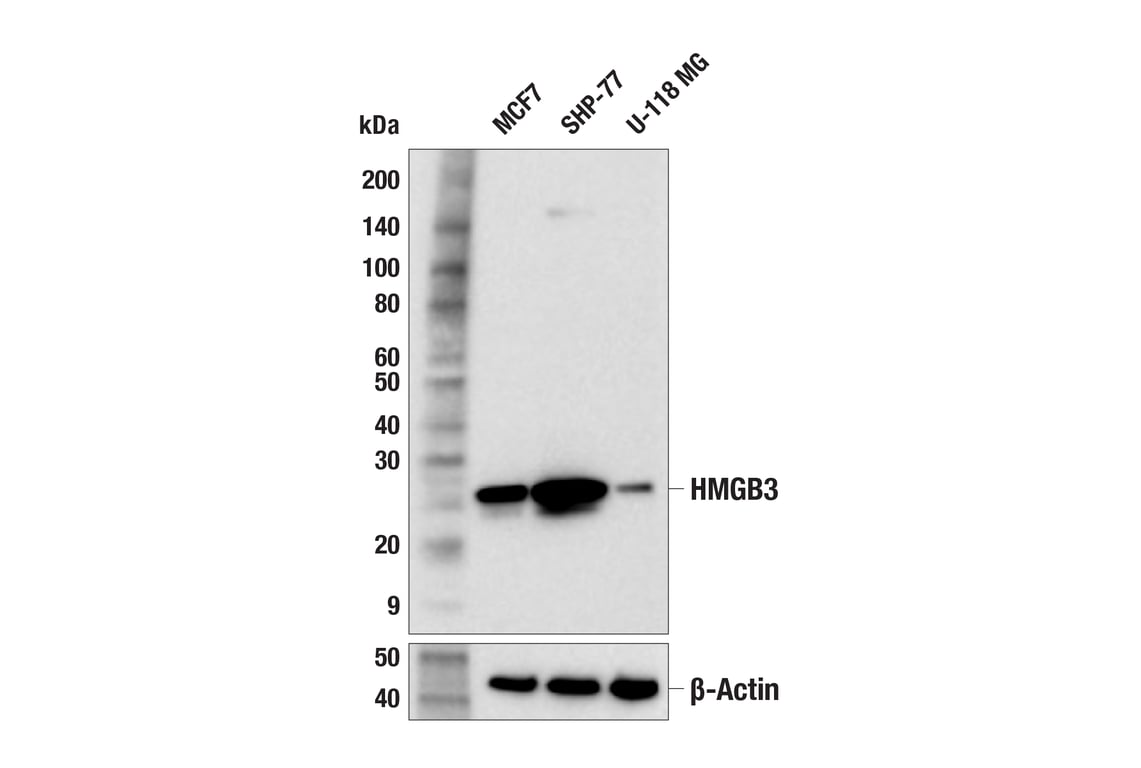 HMGB3 (F2P1J) Rabbit Monoclonal Antibody recognizes endogenous levels of total HMGB3 protein. This antibody does not recognize HMGB1 or HMGB2 protein.