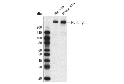 Huntingtin (D7F7) Rabbit Monoclonal Antibody (BSA and Azide Free) detects endogenous levels of total huntingtin protein. Species cross-reactivity for IHC-P is in rodent only.