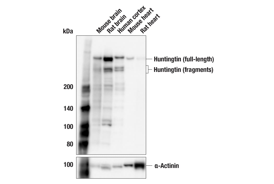 Huntingtin (F9N6S) Rabbit Monoclonal Antibody recognizes endogenous levels of total huntingtin protein. This antibody detects a 110 kDa protein of unknown identity in some cell lines.