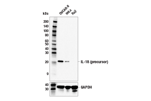 IL-18 (E3G8R) Rabbit Monoclonal Antibody (BSA and Azide Free) recognizes endogenous levels of total IL-18 protein.
