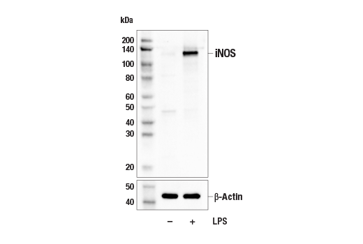 iNOS (E1W4J) Rabbit Monoclonal Antibody recognizes endogenous levels of total iNOS protein. This antibody detects non-specific bands of unknown origin in cell extracts at 25 kDa, 45 kDa, and 80 kDa.