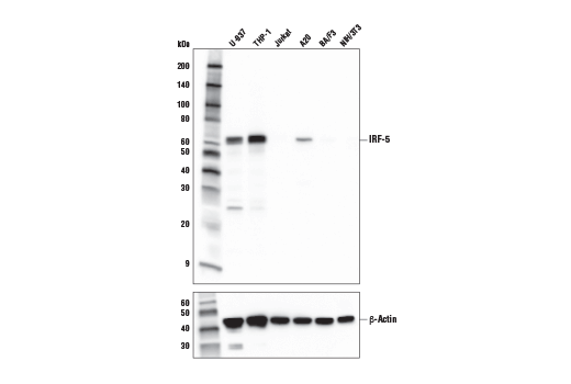 IRF-5 (E9I4Z) Rabbit Monoclonal Antibody recognizes human IRF-5 protein and is also reactive with mouse IRF-5 protein; however, this antibody is not suggested for immunofluorescent analysis of human samples. Instead, IRF-5 (E7F9W) Rabbit Monoclonal Antibody #76983 is recommended for immunofluorescent analysis of human samples.