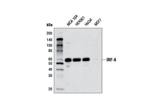 While IRF family members generally function in innate immune responses, IRF-6 has not been associated with that role. Original studies of IRF-6 found that mutation of the IRF-6 gene caused Van der Woude Syndrome, an autosomal dominant disorder resulting in mouth abnormalities, including cleft lip and palate (3). IRF-6 knockouts show a hyperproliferative epidermis that fails to undergo keratinocyte differentiation (4). IRF-6 has also been found to interact with the mammary tumor suppressor maspin, and like maspin, is expressed in normal mammary epithelial cells but reduced or absent in breast carcinoma (5). Cellular proliferation may promote IRF-6 phosphorylation, leading to proteasomal-dependent degradation (6).