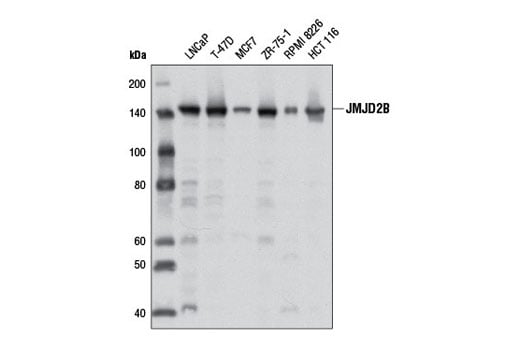 JMJD2B (D7E6) Rabbit Monoclonal Antibody recognizes endogenous levels of total JMJD2B protein. This antibody does not cross-react with other Jumonji C proteins, including JMJD2A, JMJD2C, and JMJD2D.