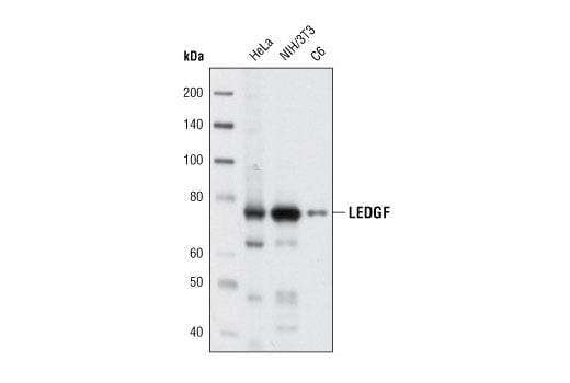 The LEDGF (lens epithelium-derived growth factor) gene encodes splice variants P75 and P52 (1). LEDGF (C57G11) Rabbit mAb detects the 75 kDA LEDGF splice form. Both LEDGF variants have transcriptional coactivator functions that may regulate gene transcription and mRNA splicing of a variety of proteins that are essential for cell growth and survival. (2,3). LEDGF has also been identified as a factor that can, in serum free media, stimulate the growth and survival of lens epithelial cells and other cell types such as retinal photoreceptor cells, COS7 cells, skin fibroblasts, and keratinocytes (2). In addition to its function as a transcriptional coactivator, LEDGF has been shown to be involved in the pathogenesis of atopic dermatitis (4) and in the activity of HIV1 integrase. LEDGF binds chromatin throughout the cell cycle, and may act as a chromatin docking factor for HIV integrase and other lentiviral pre-integration complexes. It protects HIV integrase from degradation, and influences the pattern of viral integration into the cell genome (5).