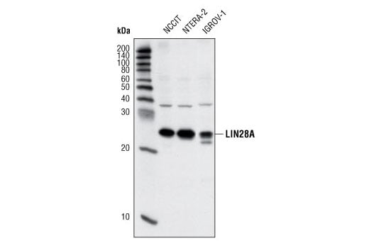 LIN28A (6D1F9) Mouse Monoclonal Antibody detects endogenous levels of total LIN28A protein.
