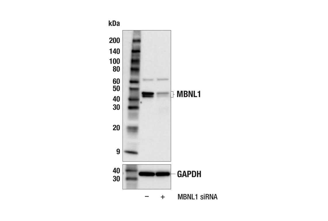 MBNL1 (E8Q7B) Rabbit Monoclonal Antibody recognizes endogenous levels of total MBNL1 protein. This antibody may detect a band of unknown origin around 62 kDa.