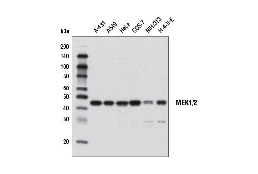 MEK1/2 (D1A5) Rabbit Monoclonal Antibody recognizes endogenous levels of total MEK1 and MEK2 proteins. This antibody is predicted to cross-react with MEK1/MEK2 orthologs in a variety of species.