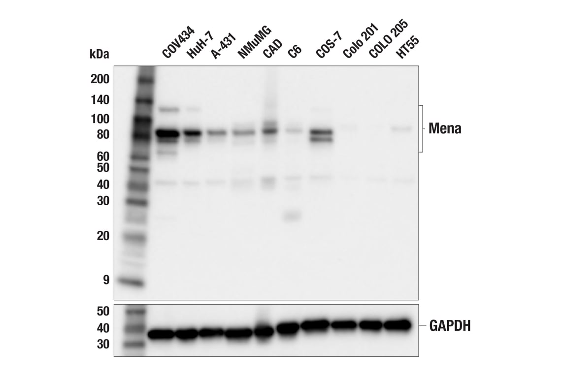 Mena (F5Z9K) Rabbit Monoclonal Antibody recognizes endogenous levels of total Mena protein. This antibody cross-reacts with a 45 kDa protein of unknown identity in some cell lines. Non-specific staining was observed in human stomach by immunohistochemistry. Species cross-reactivity for IHC-P is human only.