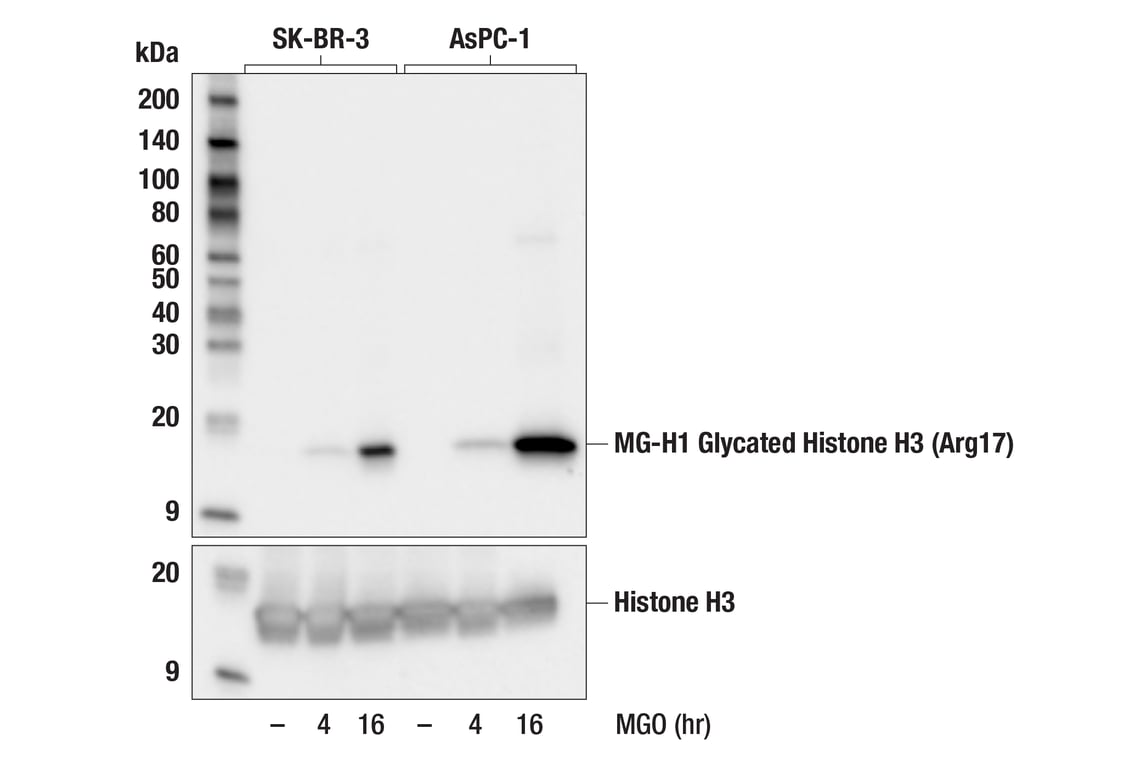 MG-H1 Glycated Histone H3 (Arg17) (E2W7I) Mouse Monoclonal Antibody detects endogenous MGO-derived glycation of the MG-H1 subtype at Arg17 of histone H3. This antibody may also weakly detect MG-H2 glycated Arg17 of histone H3.