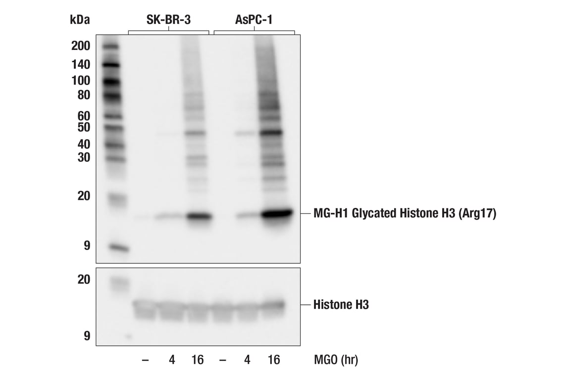 MG-H1 Glycated Histone H3 (Arg17) (E3Z1R) Rabbit mAb detects endogenous MGO-derived glycation of the MG-H1 subtype at Arg17 of histone H3. This antibody may also weakly detect MG-H2 glycated Arg17 of histone H3. In addition, this antibody appears to weakly detect an additional MG-H1 glycated arginine residue on histone H3.