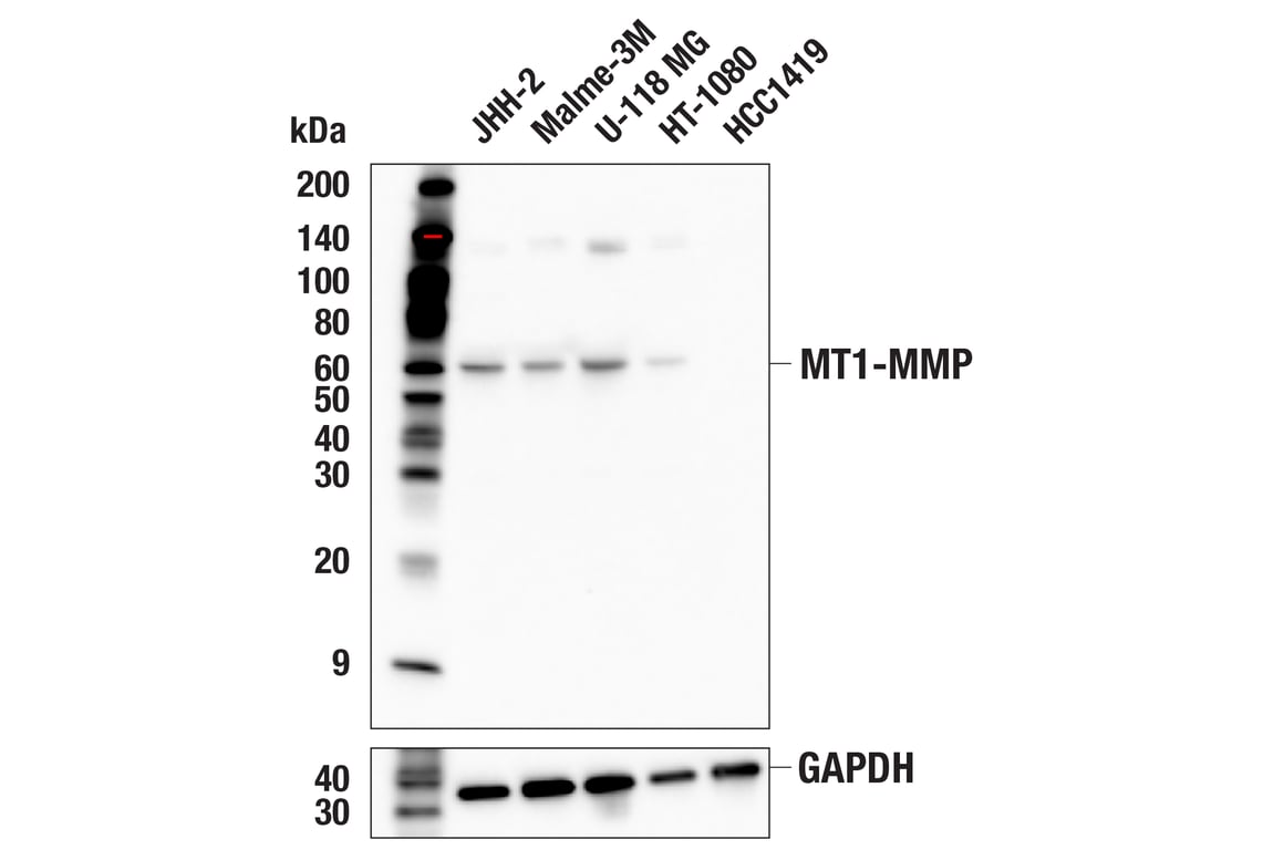 MT1-MMP (E3S5S) Rabbit Monoclonal Antibody recognizes endogenous levels of total MT1-MMP protein. This antibody cross-reacts with a band at 135 kDa of unknown origin.