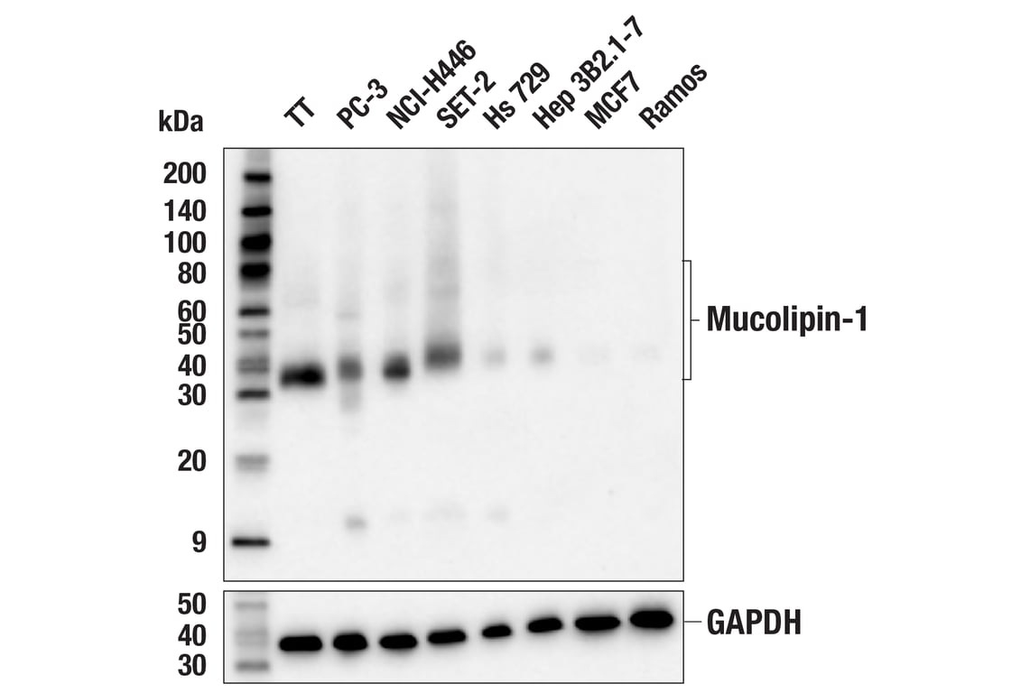 Mucolipin-1 (F8F9Q) Rabbit Monoclonal Antibody recognizes endogenous levels of total mucolipin-1 protein. This antibody detects the carboxyl terminal fragment produced following posttranslational cleavage.
