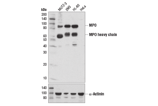 Myeloperoxidase (E1E7I) Rabbit Monoclonal Antibody (BSA and Azide Free) recognizes endogenous levels of total myeloperoxidase protein. This antibody recognizes the full-length and heavy chain subunits of human myeloperoxidase protein.