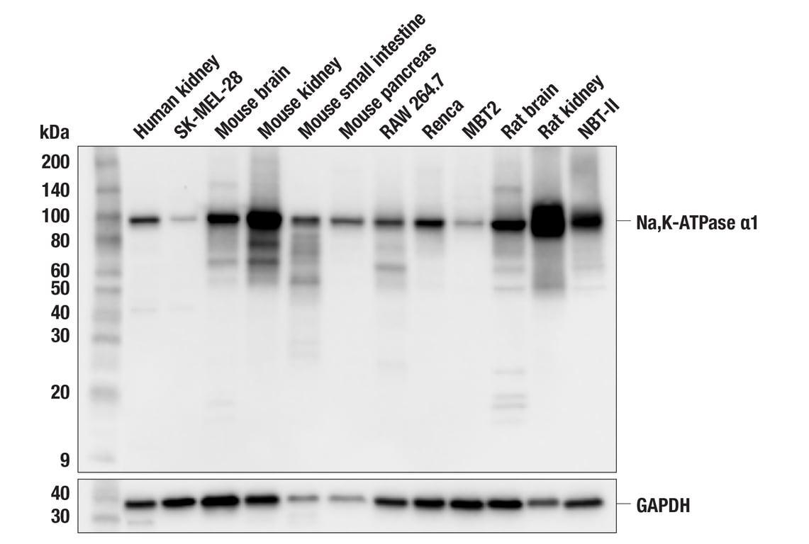 Na,K-ATPase alpha1 (F7K1P) Rabbit Monoclonal Antibody recognizes endogenous levels of total Na,K-ATPase α1 protein. This antibody does not cross-react with other Na,K-ATPase α proteins. Species cross-reactivity for IF and IHC-P is mouse only.