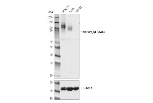 NaPi2b/SLC34A2 (D6W2G) Rabbit Monoclonal Antibody (BSA and Azide Free)recognizes endogenous levels of total NaPi2b/SLC34A2 protein.