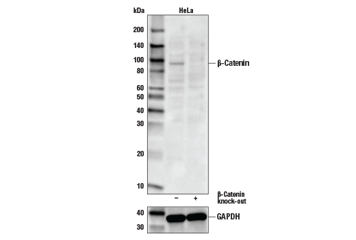 Non-phospho (Active) β-Catenin (Ser33/37/Thr41) (D13A1) Rabbit mAb #8814 is designed to specifically recognize the stabilized form of β-catenin, i.e., protein that has not been phosphorylated by GSK-3, and thus is functionally active in cell-cell adhesion and/or the canonical Wnt signaling pathway.
