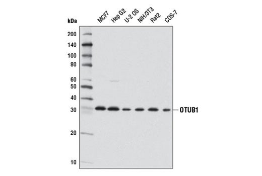 OTUB1 (D8F7) Rabbit Monoclonal Antibody recognizes endogenous levels of total OTUB1 protein. This antibody does not cross-react with OTUB2 and based upon sequence alignment, is not predicted to cross-react with OTUB1, isoform 2 (ARF-1).