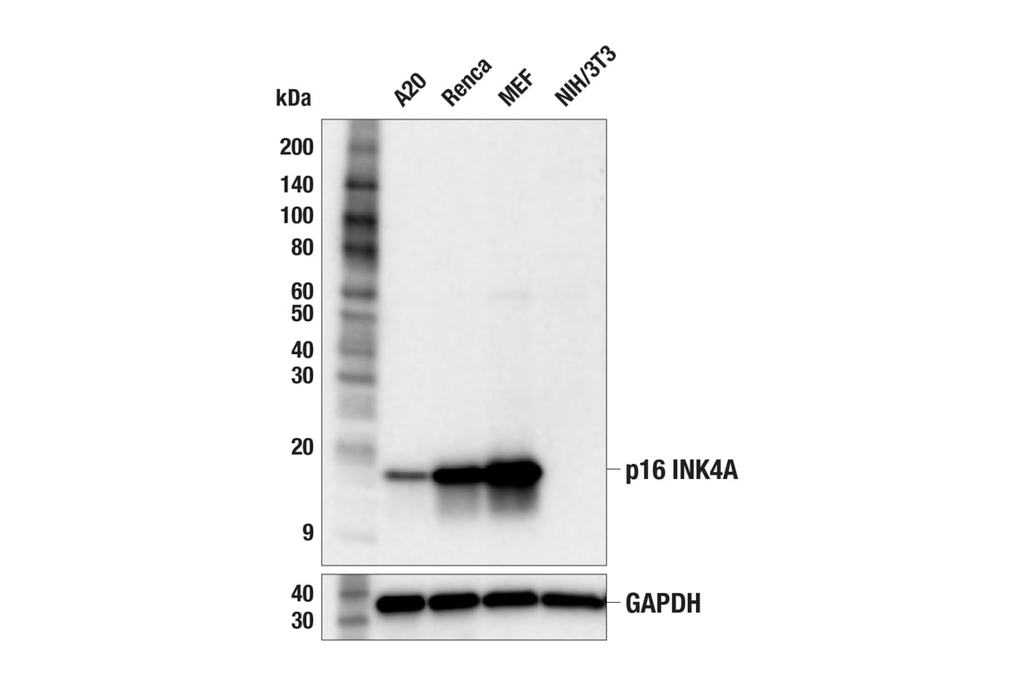 p16 INK4A expression, typically repressed in the absence of stress, is thought to drive cells into senescence, and p16 INK4A expression is a commonly used marker of senescent cells (2,3). p16 INK4A protein expression is often altered in human cancer, and high expression is currently used as a predictive biomarker in cervical cancer (3-5).