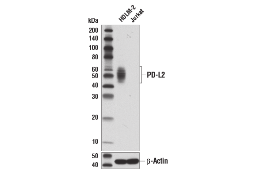 Programmed cell death 1 ligand 2 (PD-L2, B7-DC, CD273) is a member of the B7 family of cell surface ligands that regulate T cell activation and immune responses (1,2). PD-L2 binds the PD-1 transmembrane receptor and inhibits T cell activation. PD-L2 was discovered following a search for novel B7 protein homologs and was later shown to be expressed by activated dendritic cells, macrophages, and T cells (1,3). Similar in structure to related B7 family members, PD-L2 protein contains extracellular IgV and IgC2 domains, a transmembrane domain, and a short, cytoplasmic region. Research studies demonstrate that PD-L2 is expressed in several tumor types, including lung cancer, renal cell carcinoma, melanoma, Hodgkin's lymphoma and primary mediastinal large B-cell lymphoma (4-7).