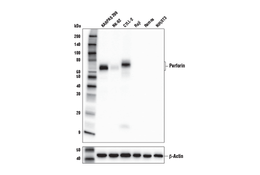 Perforin is a pore-forming protein that facilitates the entry of cytotoxic serine proteases, such as granzymes, into target cells (4). Perforin is primarily expressed in cytotoxic T lymphocytes and NK cells.