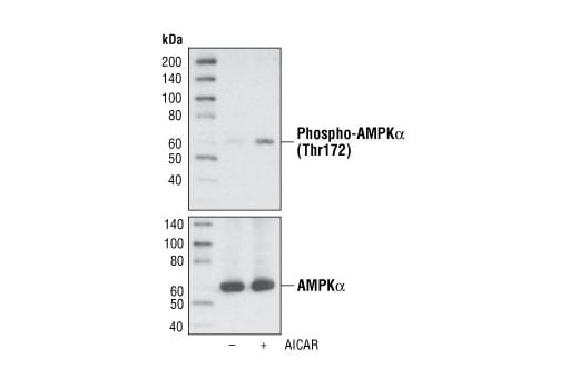 Phospho-AMPK alpha (Thr172) (D79.5E) Rabbit Monoclonal Antibody detects endogenous AMPK-alpha only when phosphorylated at Thr172. This antibody detects both α1 and α2 isoforms of the catalytic subunit, but does not detect the regulatory β or γ subunits.