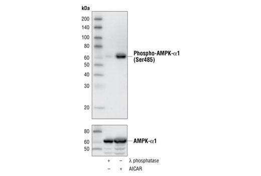 Phospho-AMPK alpha1 (Ser485) (45F5) Rabbit Monoclonal Antibody detects endogenous levels of AMPKα1 only when phosphorylated at Ser485. This antibody does not cross-react with phosphorylated AMPKα2 or other related proteins.