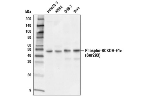 Phospho-BCKDH-E1 alpha (Ser293) (E2V6B) Rabbit Monoclonal Antibody recognizes endogenous levels of BCKDH-E1α protein only when phosphorylated at Ser292 of mature human BCKDH-E1α, Ser293 of mature mouse BCKDH-E1α, or Ser293 of mature rat BCKDH-E1α.