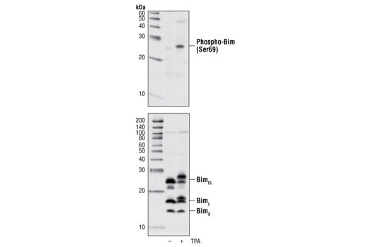 Phospho-Bim (Ser69) Antibody detects endogenous levels of Bim protein only when phosphorylated at Ser69.