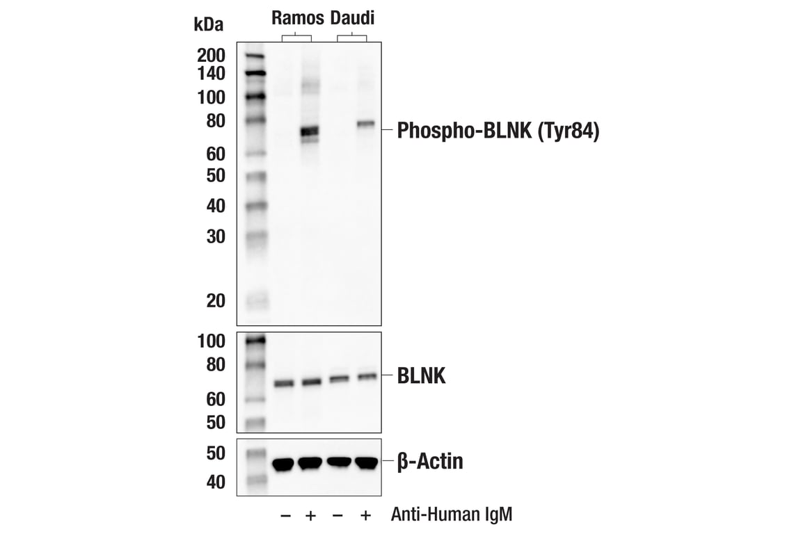 Phospho-BLNK (Tyr84) (E6A9C) Rabbit Monoclonal Antibody recognizes endogenous levels of BLNK protein only when phosphorylated at Tyr84.