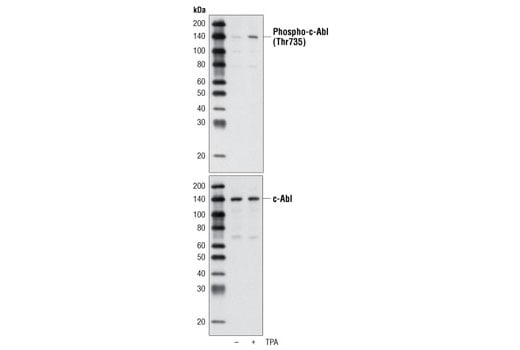 Thr735 is located within a conserved 14-3-3 protein binding motif region, and can be phosphorylated upon stress stimulation or TPA treatment. Phosphorylation at Thr735 may play an important role in regulating c-Abl localization as well as its function.