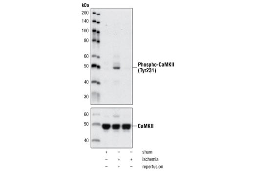 Phospho-CaMKII (Tyr231) Antibody is directed against a previously unpublished CaMKII tyrosine phosphorylation site at Tyr231 that was identified at Cell Signaling Technology (CST) using PhosphoScan®, CST's MS/MS platform for phosphorylation site discovery. Phosphorylation of CamKII at Tyr231 was observed in extracts isolated from ischemic rat brain.