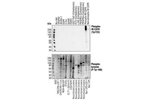 Phospho-CSF-1R/M-CSF-R (Tyr723) (49C10) Rabbit Monoclonal Antibody detects endogenous levels of CSF-1R/M-CSF-R only when phosphorylated at tyrosine 723. This antibody does not cross-react with related active protein tyrosine kinases.