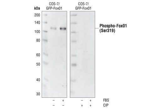 Phospho-FoxO1 (Ser319) Antibody detects exogenous levels of FoxO1 only when phosphorylated at serine 319. This antibody does not cross-reacts with FoxO1 phosphorylated at other sites nor with other phosphorylated family members.