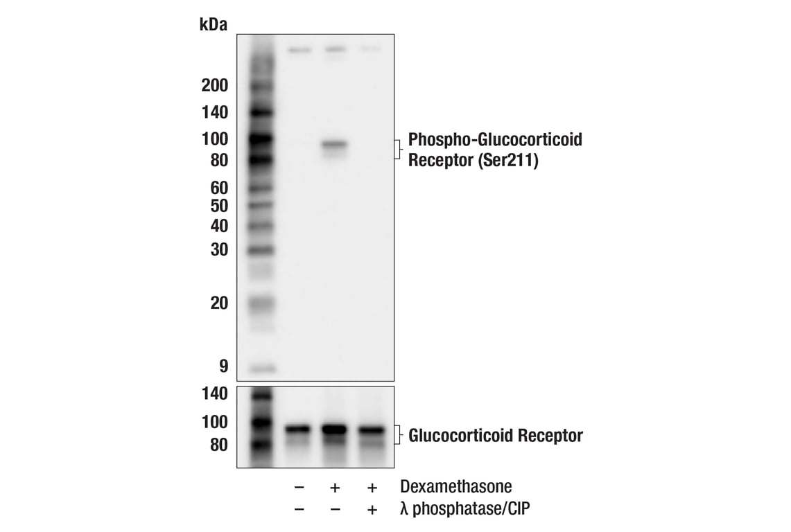 Phospho-Glucocorticoid Receptor (Ser211) (F7L7X) Rabbit Monoclonal Antibody recognizes endogenous levels of glucocorticoid receptor protein only when phosphorylated at Ser211. This antibody detects a 250 kDa protein of unknown identity in some cell lines.